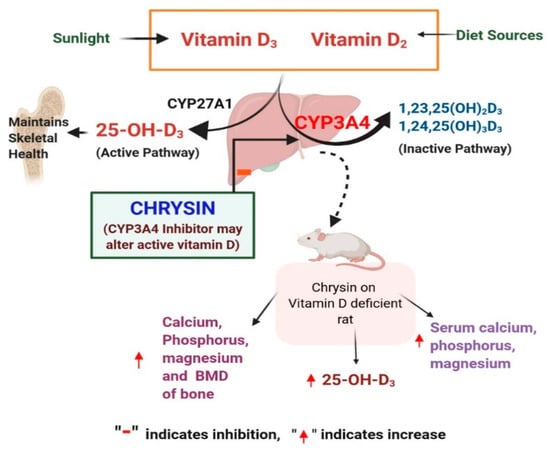 On the other hand, although hypovitaminosis D is a modifiable risk factor, the medical community is facing several challenges in terms of maintaining or achieving optimum serum vitamin D3 levels and retaining bone mass []. Respective research strategies are implemented to conquer vitamin D insufficiency by targeting sunlight exposure and climatic conditions [], gut absorption of vitamin D supplements [], vitamin D receptor (VDR) genotyping [], and metabolic expression of cytochrome P450 (CYP450) enzymes and their interplay with vitamin D [,]. CYP450 enzymes are the major class of catabolic enzymes that play a decisive role in the pharmacokinetics of drugs as well as endogenous substances. Since CYP enzymes metabolize 90% of medicinal drugs, numerous investigations implying CYP450 have become crucial for revealing unveiled drug–drug interactions []. It is possible that the interactions caused by enzymatic inhibition/induction result in diminished/enhanced metabolic compounds, which may have a greater emphasis on the kinetic and dynamic profiles of therapeutic targets []. In this regard, we focused on the multifunctional class of enzymes CYP3A4, which catalyzes 25-hydroxylated-mediated conversion of the active form of vitamin D into its inactive form []. Interestingly, research studies revealed that therapeutic substrates (inducers/inhibitors) of CYP3A4 enzymes may contribute to altering the 1,25(OH)2D3 levels in the serum []. Various systematic studies have indicated that higher doses of vitamin D3 fail to achieve optimum serum 25-OH-D3 levels in humans []. From this perspective, subsequent inhibition of vitamin D metabolism by CYP3A4 substrates may show an ameliorative effect on hypovitaminosis D. We hypothesized to enhance 25-OH-D3 levels by incorporating the well-established CYP3A4 inhibitor chrysin [], as shown in Figure 1. Chrysin is a natural flavonoid with beneficial pharmacological effects, such as anticancer, neuroprotective, hepatoprotective, cardioprotective, and antiarthritic effects [,]. It has also shown a promising outcome in osteoporotic rats []. Our research aimed to study the impact of chrysin on low-dose vitamin D3 supplementation and its further implications on vitamin D deficiency conditions and bone health.