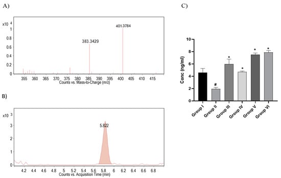 Quantification of 25-OH-D3 levels by LC-MS/MS. (A) Mass fragmentation of 25-OH-D3. (B) Ion chromatogram of the selected fragment ion (m/z 383.5 → 401.3). (C) Quantification of serum 25-OH-D3 from the area under the curve (data are expressed as the mean ± SD (n = 4), analyzed by one-way ANOVA followed by Tukey’s multiple comparison test. # = p < 0.05 is considered statistically significant when comparing group, I vs. group II. * = p < 0.05 is considered statistically significant when compared with the other treatment groups (group III, IV, V, and VI) vs. diet control group).