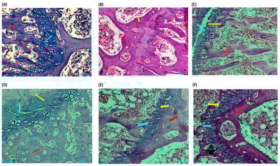 Impact of chrysin on histopathology of bone. (A) Group I (normal group); (B) Group II (disease control); (C) Group III (chrysin); (D) Group IV (chrysin + CaCO3); (E) Group V (chrysin + vitamin D3); and (F) Group VI (chrysin + vitamin D3 + CaCO3) showing alterations in normally growing cells (blue arrow) at the epiphyseal plate (yellow arrow) along with osteocytes (red arrow) in the bone matrix.