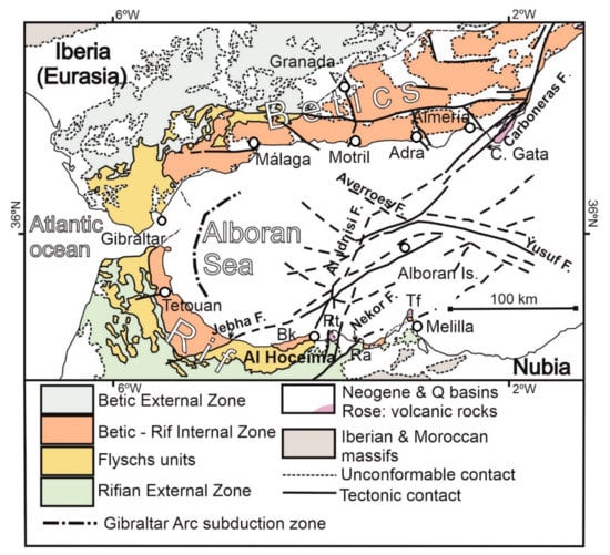 Subduction processes, combined with NNW–SSE convergence and regional compression of the Iberian and Nubian plates [,,], resulted in significant deformation in the northern and southern borders of the earliest Alboran Sea. These processes developed the Gibraltar Arc, with the uplift of the Rif and Betic Cordillera, which were radially deformed [] around the Alboran Sea and undergoing a regional E–W compression.