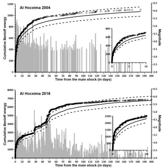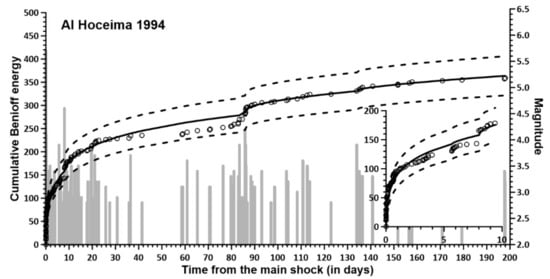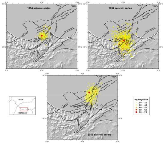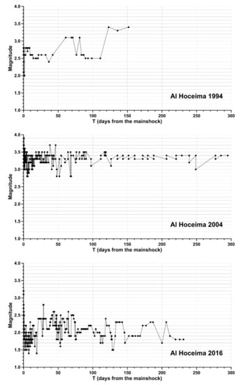In this study, we focus on three sequences of type (1) designated as the aftershock sequences of Al Hoceima 1994, 2004 and 2016, occurring near the city of Al Hoceima, in Morocco (Figure 1 and Figure 2). The multifractal properties of these sequences have already been investigated in the framework of the spatial modeling of many seismic series in the Ibero–Maghrebian region []; however, even more temporal, energy and stress evaluations are required. Therefore, this study aims to examine three aftershock series using stochastic modeling.