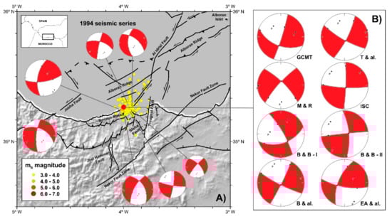 (A) 1994 seismic sequence showing earthquakes with magnitude above 3.0 and computed focal mechanisms for aftershocks []. (B) Different focal mechanism solutions for the mainquake. GCMT: Global Centroid Moment Tensor; T&al.: []; M&R: []; ISC: International Seismological Centre; B&B-I and B&B-II: [], for a pre-event and the main quake, respectively; B&al.: []; EA&al.: [,].