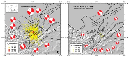 Figure 5A depicts the distribution of events with magnitudes greater than 3.0, which were included in the 2004 series, as well as the estimated focal mechanisms of the largest events. In addition, Figure 5B shows the earthquakes and computed focal mechanisms of the so-called “eastern cluster” from [].
