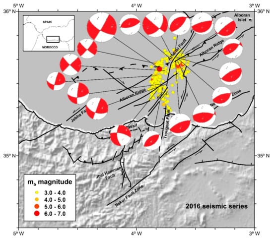 - Buforn, E.; Pro, C.; Sanz de Galdeano, C.; Cantavella, J.V.; Cesca, S.; Caldeira, B.; Udías, A.; Mattesini, M. The 2016 south Alboran earthquake (Mw = 6.4): A reactivation of the Ibero-Maghrebian region? Tectonophysics 2017, 712, 704–715. [Google Scholar] [CrossRef]