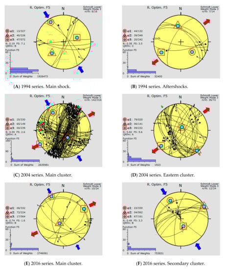 Stress regime computed from focal mechanisms. (A) For the 1994 mainshock, (B) for the 1994 aftershock sequence, (C) for the 2004 aftershock sequence, (D) for the ‘eastern cluster’ considered by [], (E) for the 2016 ‘main cluster’ and (F) for the 2016 ‘secondary cluster’.