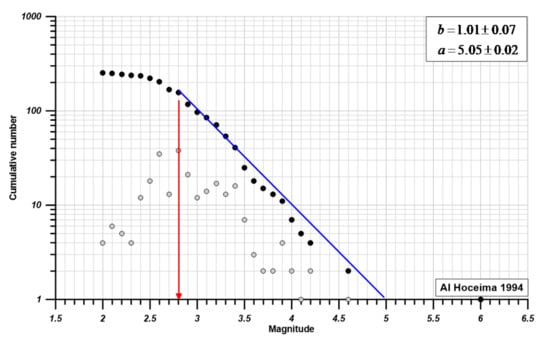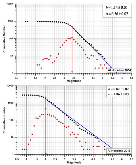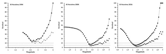 The estimated b-value appraisal for the 1994, 2004 and 2016 aftershock sequences, using the maximum likelihood estimator by [], with a bin width of 0.1 units, are 1.01 ± 0.07, 1.14 ± 0.05 and 0.82 ± 0.02, respectively (Table 1). Figure 9 shows the power law distributions for the three sequences as fitted by a straight line. The greatest magnitudes, corresponding to the mainshock, are not explained by the Gutenberg–Richter relationship and are thus regarded as outliers in all series. It is worth mentioning that the estimated maximum likelihood parameters are closely linked to and impacted by the previously determined threshold magnitude.
