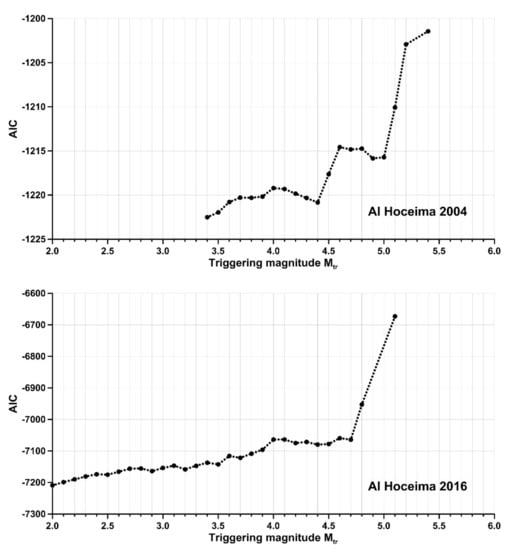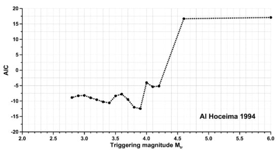 When examining the AIC values vs. curves (Figure 10), we can see that the best-fit model for the minimal AIC value was found to be for a value of 3.9 for the 1994 sequence. For the 2004 sequence, an value of 3.4 is the best-fit model obtained and, for the 2016 sequence, a magnitude of 2.0. The best-fit model became an ETAS model when the triggering magnitude coincided with the completeness threshold magnitude mc in the last two . Analyzing the AIC vs. trigger magnitude curve for the 2016 sequence, a monotonic trend exists, resulting in a continuous increase in AIC values, the lowest of which is for .