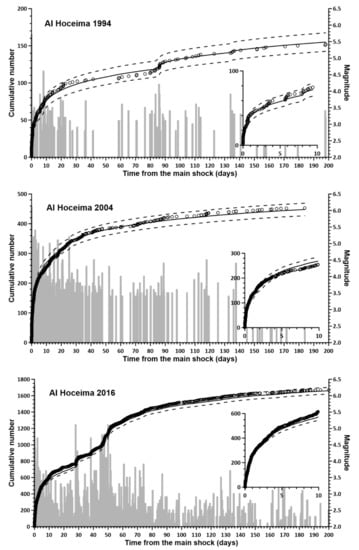 Figure 3 shows the number of events per day for the selected series in the 150 days after the mainshock, while Table 1 provides the number of events in each series, the minimum recorded magnitude and other computed parameters, which will be discussed later. The 1994 Al Hoceima sequence had 263 recorded events with a magnitude above 2.0, which occurred until December 1994 (some early events have been included in the series); the 2004 sequence had 969 recorded events with a magnitude above 1.5, which occurred until February 2005; and the 2016 Al Hoceima sequence had 2577 recorded events with a magnitude above 0.8, which occurred until August 2016.