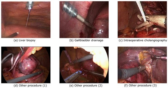 Qualitative examples of video frames associated with these surgical phases are displayed in Figure 2a–c. These three phases appeared in relatively fewer videos compared to other phases: gallbladder drainage in 26 videos, liver biopsy in 18 videos, and intraoperative cholangiography in 47 of all 384 videos (see Supplementary Figure S2 for more details). Moreover, we observed less visual variability in the surgical instruments used across interventions associated with the gallbladder drainage, liver biopsy, and intraoperative cholangiography phases in our dataset.