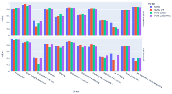 Interestingly, the online TeCNO model performed better than its offline version (TeCNO-Off) in the minority phases. This was not reflected in the aggregated accuracy metric (Table 3). Similarly, the use of weighted cross-entropy loss to train the Trans-SVNet model was crucial to increase the model recall on the minority phases (e.g., gallbladder drainage, liver biopsy). The Trans-SVNet model without weighted cross-entropy loss had a higher aggregated metric.