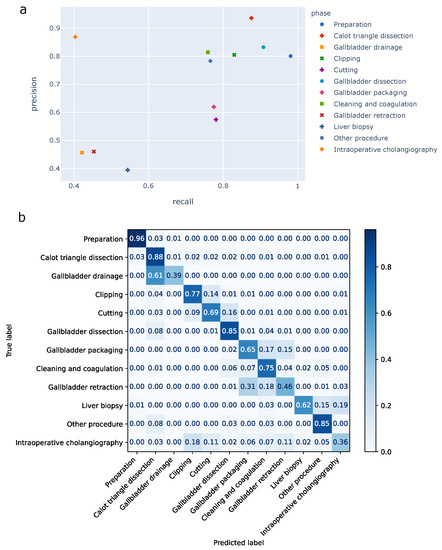 Phase-specific performance analysis of the TeCNO model on our dataset. (a) Illustration of phase level precision and recall averaged across videos. One can notice the strong variation in performance between phases. (b) The confusion matrix illustrates the confusion between phases. Every sample (frame-wise prediction and ground truth) contributed equally during the computation. Confusion between temporally closer phases was more prevalent than in temporally distant phases.