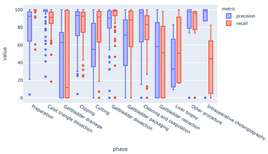 While the precision/recall averaged across all videos was rather high for most of the phases, some videos displayed poor performance for particular phases. The gallbadder drainage, gallbadder retraction, liver biopsy, and intraoperative cholangiography phases had the highest variability.