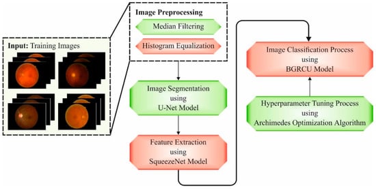In this article, a novel XAITO-DRGC technique was devised for the detection and classification of DR. Initially, the XAITO-DRGC model applies MF and contrast enhancement as a pre-processing step. In addition, the XAITO-DRGC model applies U-Net-based image segmentation and SqueezeNet-based feature extractor. Finally, AOA with BGRCU is exploited for DR detection and classification where the AOA assist in optimal hyperparameter tuning of the BGRCU model. Figure 1 depicts the block diagram of the XAITO-DRGC algorithm.