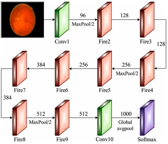 As the variable count for AlexNet and VGGNet increases, the SqueezeNet network architecture was introduced that has the lowest variable while maintaining accuracy []. The fire module becomes the essential module in SqueezeNet, as well as its architecture, as given in Figure 2. This module can be divided into Expand and Squeeze architecture. The convolution layer received considerable attention in the network architecture. The work explains from the perceptive of cross channel pooling whereas multilayer perceptron (MLP) was equivalent to the cascaded cross channel parametric pooling layer behind the traditional kernel, thus achieving data integration over the channel and linear incorporation of several feature maps. Once the amount of input and output channels were greater, the convolutional kernels become large. Then, adding 1 × 1 convolutions to every single inception mechanism reduces the number of input channels, as well as the complexity operation and convolution kernel variables are decreased. Lastly, add 1 × 1 convolutions to increase the feature extraction and the number of channels. Once the sampling reduction method can be delayed, a larger activation graph was provided to the convolution layer, whereby the larger activation graph preserves further data and provides better classification performance.