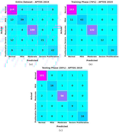Confusion matrices of the XAITO-DRGC approach under the APTOS 2019 dataset (a) entire dataset, (b) 70% of TR data, and (c) 30% of TS data.