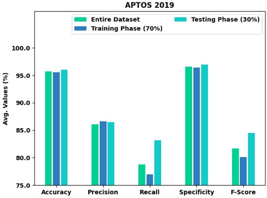 Table 2 and Figure 4 provide an overall classification output of the XAITO-DRGC model on the APTOS 2019 dataset. The experimental values notified that the XAITO-DRGC model has shown enhanced results under distinct aspects. For instance, with the entire dataset, the XAITO-DRGC model has offered an average of 95.69%, of 86.04%, of 78.81%, of 96.59%, and of 81.69%. Meanwhile, with 70% of TR data, the XAITO-DRGC approach has provided an average of 95.56%, of 86.59%, of 77.01%, of 96.42%, and of 80.13%. Eventually, with 30% of TS data, the XAITO-DRGC algorithm has rendered an average of 96%, of 86.48%, of 83.14%, of 96.97%, and of 84.52%.