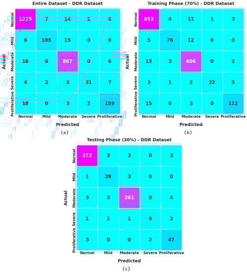 Confusion matrices of the XAITO-DRGC approach under the DDR dataset (a) entire dataset, (b) 70% of TR data, and (c) 30% of TS data.