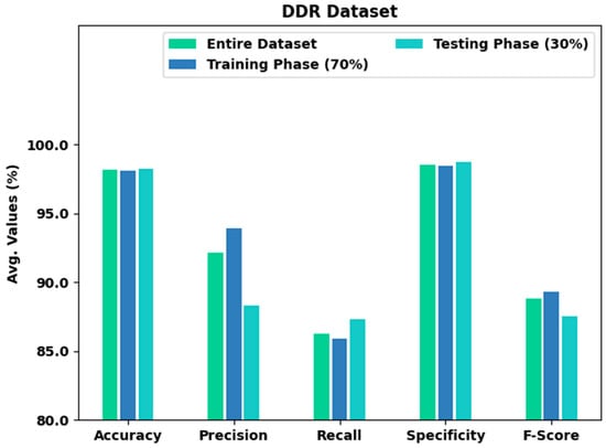 Table 4 and Figure 9 present an overall classification output of the XAITO-DRGC technique on the DDR dataset. The experimental values notified that the XAITO-DRGC method has shown enhanced results under distinct aspects. For example, with the entire dataset, the XAITO-DRGC method has rendered an average of 98.15%, of 92.13%, of 86.26%, of 98.55%, and of 88.78%. At the same time, with 70% of TR data, the XAITO-DRGC technique has offered an average of 98.11%, of 93.89%, of 85.90%, of 98.45%, and of 89.31%. Finally, with 30% of TS data, the XAITO-DRGC methodology has rendered an average of 98.24%, of 88.32%, of 87.30%, of 98.77%, and of 87.54%.