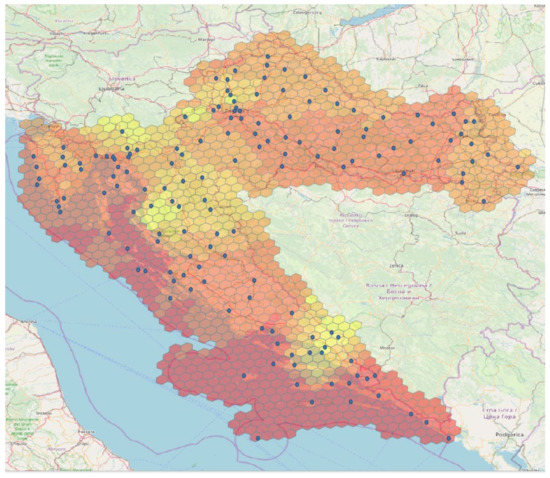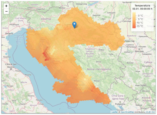 The interpolation is calculated for each grid cell covering the Croatian territory using the methods and parameters chosen in the validation phase and the measured values from the DHMZ weather stations. We used the Discrete Global Grid System (DGGS) [42], a new standard that aims to reference the entire Earth spatially uniquely, more specifically its version Icosahedral Snyder Equal Area aperture 3 Hexagonal Grid, ISEA3H figure on level 12. The interpolation is performed for each cell centroid of the grid to generate temperature layers for specific time points. The example is shown in Figure 1.