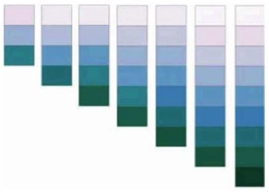 For each color scheme in the ColorBrewer tool, the user can select the number of colors or shades to use when creating a map. Figure 3 shows a sequential scheme that ranges from pink to blue-green and contains three to nine color classes in ascending order. Using fewer color classes in a map provides better contrast between classes, while more classes provide more options for displaying and reading the data. In ascending order, lighter hues in sequential schemes and perceptually colder colors in diverging schemes are used to represent lower values, while darker hues and perceptually warmer colors are used to represent higher values. In descending order, the representation is reversed. Exceptions with respect to the order of colors are qualitative color schemes in which the colors are not ordered (see Figure 2).
