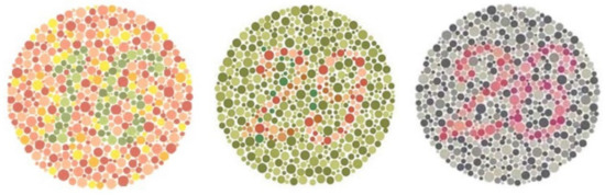 - ColorBlindness: Ishihara Color Test. Available online: https://www.colour-blindness.com/colour-blindness-tests/ishihara-colour-test-plates/ (accessed on 1 July 2022).