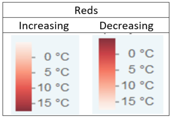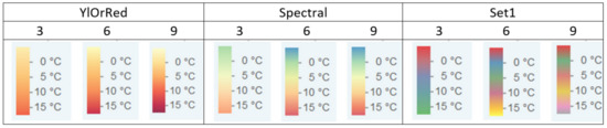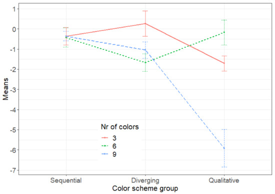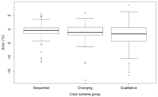 We can summarize the results for visualizing temperature on geographic maps as follows. Sequential color schemes significantly outperformed other schemes in user reading of temperature values. Qualitative color schemes are significantly inferior to the other color schemes, with the worst combination being the qualitative scheme with nine colors. Further examination of the color schemes in the best performing group, the sequential group, revealed no significantly better color scheme among the two observed (YLOrRd/Reds). It also appears that the user’s reading accuracy is not related to the number of colors used in the color schemes (3/6/9) nor to the order of the colors on the respective maps (ascending/descending). The results are consistent with related studies showing that sequential color schemes best represent sequential data [56,57].