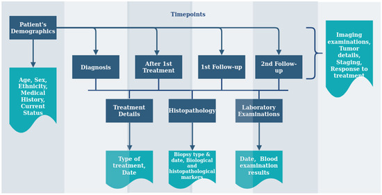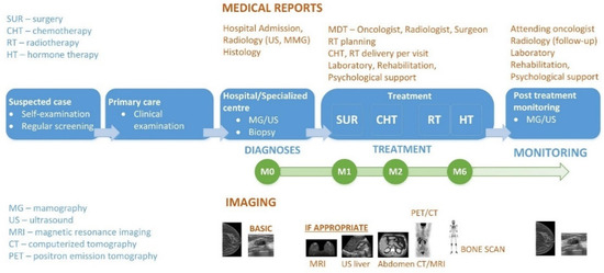 Although national guidelines define breast cancer care pathways, they are aligned around internationally recognized good practice in the diagnosis and treatment of breast cancer [40,41]. The care pathways in the participating countries correspond to the clinical workflow diagram presented in Figure 5. The patient journey is usually initiated upon a patient self-examination or as a result of a regular annual screening, and all suspected cases are directed to primary healthcare centers. General practitioners (GPs) collect the information, examine the patient, and ensure that patient has been directed to a hospital (one stop breast clinics) or a specialized center for further examination and diagnoses (including mammography (MG), ultrasound (US), and/or magnetic resonance imaging (MRI) if appropriate). Within the same institution, the patient undergoes fine-needle aspiration (FNA) or core biopsy if appropriate. When the suspected case is confirmed, if needed, the patient undergoes additional imaging, such as liver US, abdominal MR, computerized tomography (CT) scans, bone scans, and positron emission tomography (PET). With these clinical and imaging examinations, the first steps of treatment can be defined. Due to the complexity of the disease, diagnostic and therapeutic tools call for the involvement of many specialists, i.e., radiologists, pathologists, oncologists (clinical and radiation), breast surgeons, and nuclear medicine physicians. In the treatment process, the patient is followed by a multidisciplinary team (MDT), including an oncologist, a radiologist, a breast surgeon, and a pathologist, while the patient care, recovery, and support process is assisted by psychological support and rehabilitation services. Post-treatment monitoring includes MR, US, or/and MR imaging at regular intervals, either annual or bi-annual. The clinical workflow results in multiple time points (TPs) on a patient journey which are documented in the common data schema.