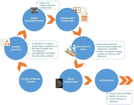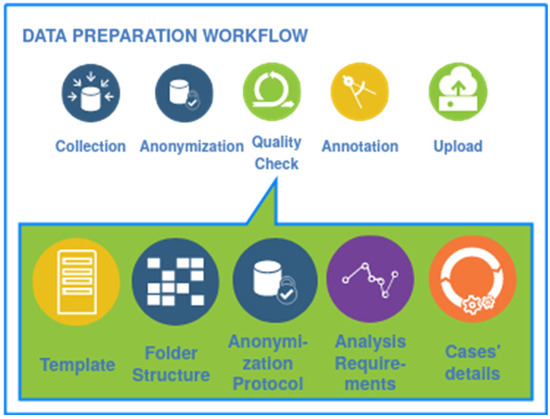 All data providers were given instructions on the steps to follow to make data collection as uniform as possible. In addition, a data quality check was also performed on a local level to detect possible problems and support the data provider in correcting them before uploading data to the INCISIVE repository [27]. These included checks of the structured data (for structural and semantic compliance with the template, the existence of duplicates, and the absence of mandatory values), as well as checks of the imaging data hierarchy and Digital Imaging and Communications in Medicine (DICOM) files. The data preparation workflow, along with the several components of the data integration quality check tool, is described in Figure 2.
