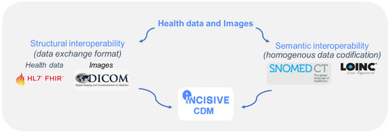 In INCISIVE, the data (including health and imaging data) transformation to a common data model (CDM) is the cornerstone of the data harmonization process that enables the aggregation of clinical data for data consumers, data findability, data accessibility, and data reusability (in compliance with FAIR principles—findable, available, interoperable, and reusable) [21] for driving the development of trustworthy AI tools that can provide an accurate and prompt diagnosis of cancer, prediction, and follow-up. To date, within the health and life sciences sector, many efforts are being made to standardize vocabularies, establish ontologies, and interoperable standards. Nonetheless, in terms of structural data interoperability, two main interoperability standards (the HL7 FHIR for clinical data and DICOM for medical imaging) are widely used, and probably the most used, in the sector. It is therefore natural that the choice of these two standards has been made for INCISIVE. When it comes to the terminology adopted for semantic interoperability, INCISIVE has based its CDM on the SNOMED ontology for clinical data and LOINC (Logical Observation Identifiers Names and Codes) [32,33,34] (Figure 3). SNOMED [35] is a standardized, international, and multilingual core set of clinical healthcare terminology, and LOINC is an international standard for identifying health measurements, observations, and documents. Both of them are widely used ontologies, thus ensuring and maximizing the interoperability of INCISIVE data, as well as the sustainability of INCISIVE.