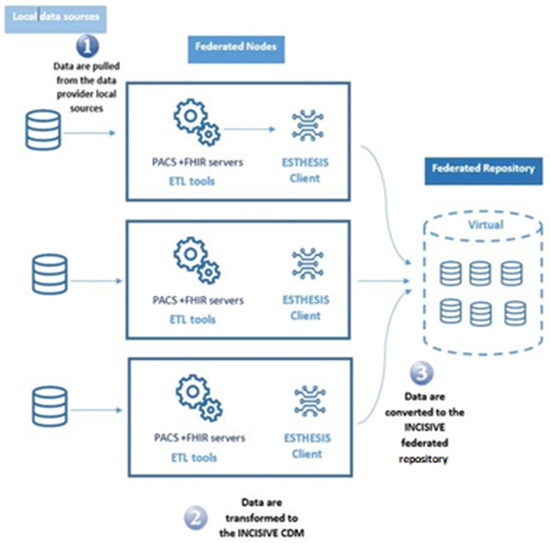 In medical imaging, the naturally adopted standard is DICOM, which stands for digital imaging and communications in medicine. More specifically, DICOM is a clinical messaging syntax used to exchange medical images between medical equipment and information systems. This standard enables the distribution, storage, and viewing of medical images. It also allows the integration of scanners, servers, workstations, printers, and network hardware from multiple manufacturers into a picture archiving and communication system (PACS). When it comes to AI development, imaging-related information generated after the acquisition of images, and in particular by radiologists reading exams, is essential and allows the capture of contextual information and the enrichment of data. Beyond DICOM images, DICOM standardizes many other types of data, such as imaging reports, measurements, annotations, and segmentations. For images, INCISIVE follows a similar procedure to clinical data with a second ETL tool that reads DICOM files placed in a directory and then sends them to an underlying PACS server. The PACS server integrates and enables the unified management of DICOM images in the INCISIVE infrastructure, through the esthesis client [36] (see Section 4.2), which is responsible for securely interconnecting the federated nodes and the federated repository. Figure 4 illustrates the INCISIVE ETL process.