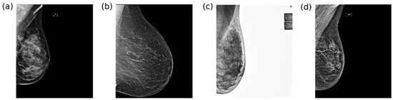 MG images from the INCISIVE retrospective database in original size, all intended for presentation, and originating from different data providers: (a) AUTH, (b) GOC, (c) HCS, and (d) UNS. Note that images from different providers and different manufacturers might undergo different processing steps from a raw image format, which is an unavailable piece of information.
