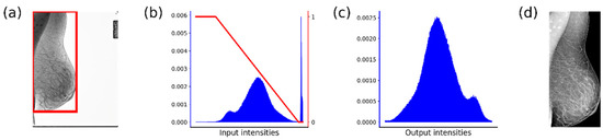 (a) An MG image in original size with an indicated region of interest, (b) a histogram of the original image (in blue) and intensity transformation applied for image enhancement (in red), (c) a histogram after pre-processing, and (d) a preprocessed image.