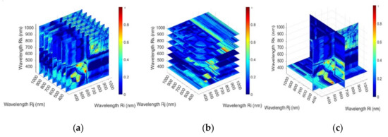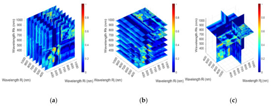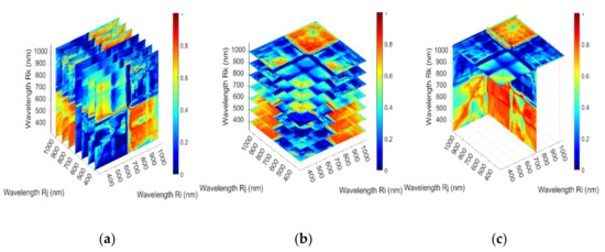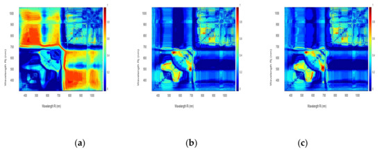 The KI for all of the possible reconstructed two-band combinations of RDSI, RNDSI, and RRSI were analyzed at the 1 nm interval with the full range of 345–1075 nm; Figure 1 shows the KI contour maps. According to Figure 1, the band combinations of higher KI were extracted from the hotspot areas as the better spectral index to grade the disease severity. As shown in the KI contour map, within the full wavelength, compared with Figure 2b,c, there were large continuous hotspots in Figure 2a, whereas the greatest KI values of 1 were mostly in a small number of hotspots (Figure 2b,c) among the three contour maps.