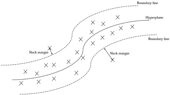 where, is the number of independent variables, is a hyperparameter that represents the regularization, and , is the slack margin [50]. The representation of this model can be seen in Figure 2.