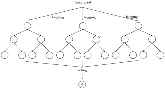 RF model consists of the synchronized operation of several unrelated decision trees. Training process is made through bagging. This technique ensures the independence of each of the decision trees and reduces the sensibility of the model to data variations [51,52]. The cost function of this model, , depends on the complexity of each of the decision trees, , in addition to the loss function, Equation (3).