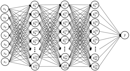 Deep Learning models have been configured using the bottleneck composition, where the number of hidden neurons decreases as the number of hidden layers increases [55]. Patterns are extracted by means of the interconnection of the different sets of neurons. The Deep Learning models propagate information from the input layer to the output layer through these hidden interconnections [56]. The cost function in these models is directly governed by the loss function, Equation (5).