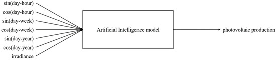Photovoltaic production forecasting problem, where the Artificial Intelligence model corresponds to the considered Machine Learning or Deep Learning model.