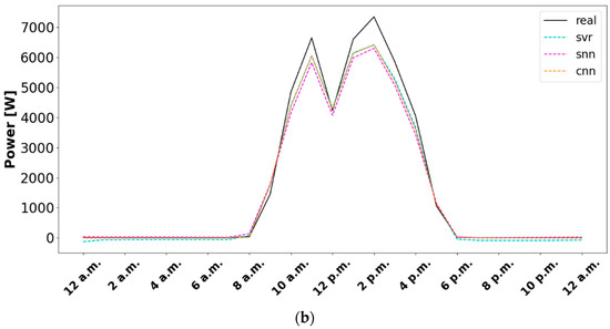 As can be seen in Figure 7, the adjustments of the SVR, SNN, and CNN models are not so good in the test set, generating underpredictions. So, as can be seen in (a), from 10 a.m. to 3 p.m., where the mean errors are 3.05% in SVR, 3.49% in SNN, and 2.78% in CNN, and in (b), from 1 p.m. to 4 p.m., with mean errors of 4.08% in SVR, 5.87% in SNN, and 4.47% in CNN, neither model fits the real data perfectly. In this case, i.e., the test set, the SVR continues to underpredict the nights, where the mean error is 1.50%, meanwhile the other two models continue having no error. The SNN model has slightly worse forecasts than SVR and CNN models during nights.