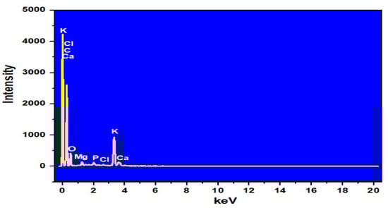 From Figure 8, the point of zero charge () of the ACMP was = 5.34. This verifies that the surface charge of the ACMP was positive when the pH was < , and it became negatively charged when the pH was > .
