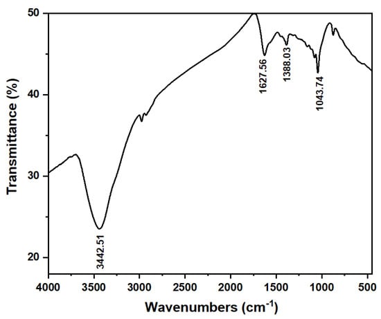 The functional groups on the surface of the ACMP were examined through FT-IR infrared spectroscopy, as shown in Figure 5. Particularly, there was a broad-spectrum pattern at 3442.51 cm−1 attributed to the -OH group. Another spectrum pattern at 1627.56 cm−1 was ascribed to the valence vibration of the carbonyl group C=O (carboxylic). The infrared absorption of the symmetric CH group was shown at the peak spectrum positioned at 1388.03 cm−1. The absorption spectrum located at 1096.24 cm−1 can be attributed to the oscillation of the C–O [].