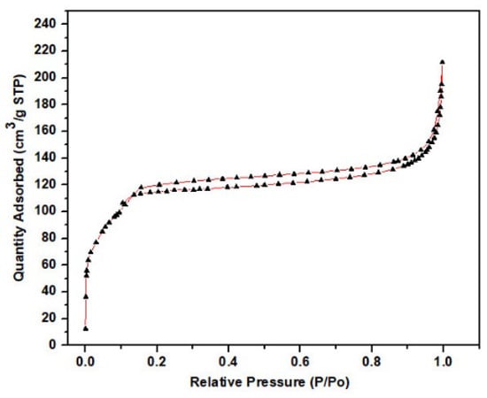 The surface properties and capillary structure of the ACMP were then studied by an N2 adsorption–desorption method on a Micromeritics-3030 USA machine, as shown in Figure 6. It can be seen that the ACMP exhibited a type IV sorption isotherm curve with an H4 hysteresis loop. Type IV isotherms are common in porous adsorbents where capillary condensation occurs. Furthermore, H4 hysteresis loops are commonly found in adsorbents with particle sizes ranging from micropores to medium-sized pores. Figure 6 shows that the volume of the N2 gas was adsorbed at the relative pressure P/P0 (0–0.2), indicating the presence of micropore-sized material. The existence of material with a medium pore size is shown at the relative pressure P/P0 in the range of 0.2–0.9. Furthermore, a small tail at the relative pressure P/P0, closer to 1.0 (>0.9), indicates the presence of a large pore-sized material. Therefore, the ACMP contains mainly medium-sized pores. This result is similar to the study published by Zhang et al. [], where they authors made activated carbon from mangosteen peel and activated it with H3PO4. On the other hand, from the BET measurement results, the average capillary volume was 0.279465 cm3/g and the average pore diameter was 2.66249 nm, which is consistent with the results of the nitrogen adsorption–desorption isotherms of the ACMP. The specific surface area of the ACMP was then measured as 419.8554 m2/g.