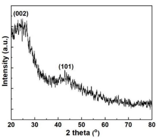 The XRD pattern of the ACMP is presented in Figure 7, showing two particular diffraction peaks in the range of 2θ = 200–300 and 2θ = 400–500. The presence of these peaks could be attributed to the lattice planes of 002 and 100 of the activated carbon. Therefore, the as-prepared ACMP possessed a graphite structure. This finding is consistent with the study on activated carbon’s structure published by Zhang et al. [].