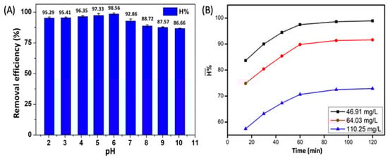 where H is the adsorption efficiency, C0 is the initial concentration (mg/L), and Ce is the concentration at adsorption equilibrium (mg/L).