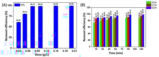 As presented in Figure 10B, the graph lines show the dependence of the CIP adsorption efficiency on the reaction time at different CIP concentrations, and they both exhibited the same graph trend. Specifically, in the period from 15 to 120 min, the adsorption efficiency increased relatively quickly from 15 to 60 min, and it increased almost linearly. Then, it gradually stabilized in the period of 60 to 120 min because, initially, adsorption was fast due to the vacant adsorption sites on the adsorbent surface. After 120 min, adsorption slowed down due to the reduction in the number of available adsorption sites []. Therefore, adsorption equilibrium can be achieved in 60 min.