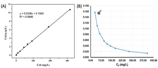 The dependence of Ccb/q on Ccb to the CIP adsorption parameter value RL (A) versus C0 (B).