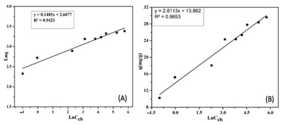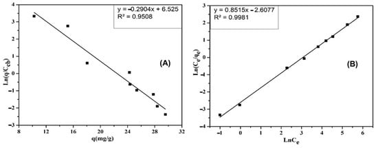As seen in the results shown in Table 6, the coefficients of determination R2 of the models—Freundlich, Elovich, Tempkin, and Redlich–Peterson—are 0.9986, 0.9421, 0.9653, 0.9508, and 0.9981, respectively.