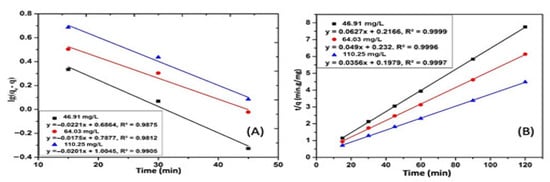 where qe and qt are the adsorption capacities at the time of reaching equilibrium and at time t (mg/g), respectively; and k1 and k2 are the apparent first-order (time−1) and second-order (g·mg−1. time−1) adsorption rate constants.