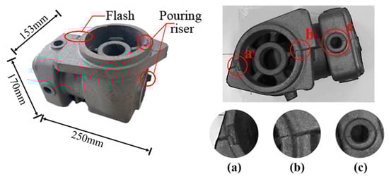 Physical drawing of casting. (a) Pouring riser area. (b) Flash area. (c) Flash area.