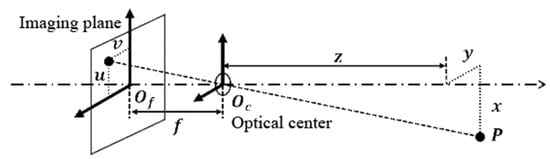 The quality of the camera calibration has a direct impact on the correctness of the final image [11]. The imaging principle was approximated during calibration as the small-aperture imaging model depicted in Figure 3 to determine the camera’s internal characteristics. The matrix represented in Equation (1) can be used to express the relationship between the point P(x,y,z) in space and the point (u, v) projected in the pixel coordinate system after shooting, where (u0, v0) is the coordinate of the intersection of the image plane and the optical axis, s is the scaling factor used to convert pixel values into length values, R is the rotation matrix of the coordinate system, T is the offset vector of the coordinate system, etc.: