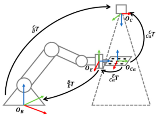 After moving the robot and changing the position of the calibration plate, the pictures of the calibration plate are taken. The equations obtained are eliminated and the matrix vectorized to obtain Equation (8). The transformation matrix between the camera and the base coordinate system was solved by the method of least square: